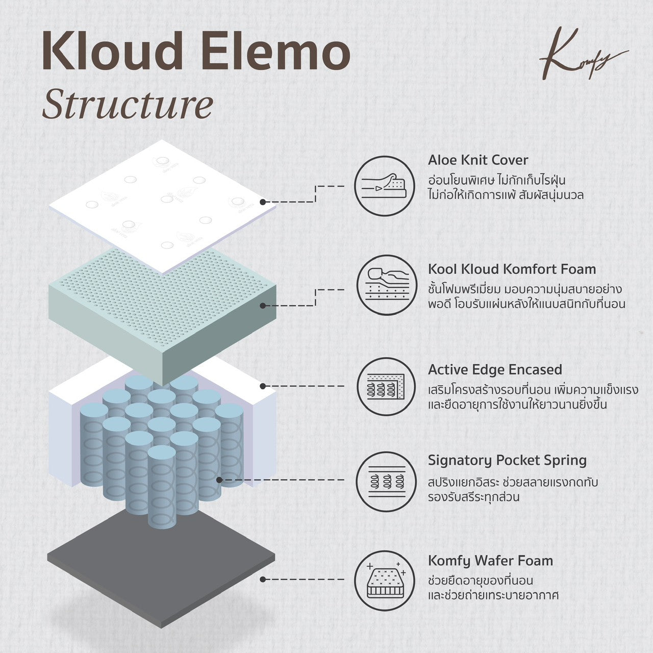 4th Layer : Komfy Wafer Foam – A specialized layer that enhances air circulation and heat dissipation while reinforcing durability, ensuring your mattress maintains its shape and support over time.