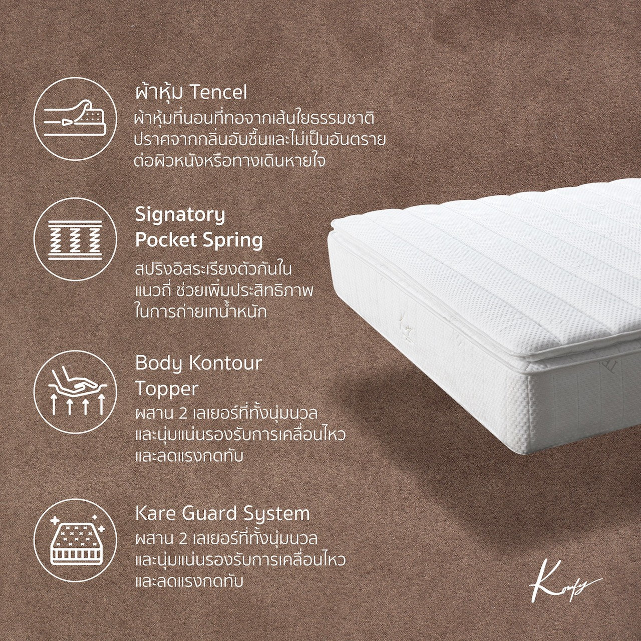 3rd Layer : Signatory Pocket Spring System – A high-density independent pocket springs in tight coil arrangement. This layer evenly distributes weight, efficiently reducing pressure points, preventing numbness and discomfort for every sleeping position. This system also isolates motion, ensuring a peaceful, undisturbed rest for both you and your partner.