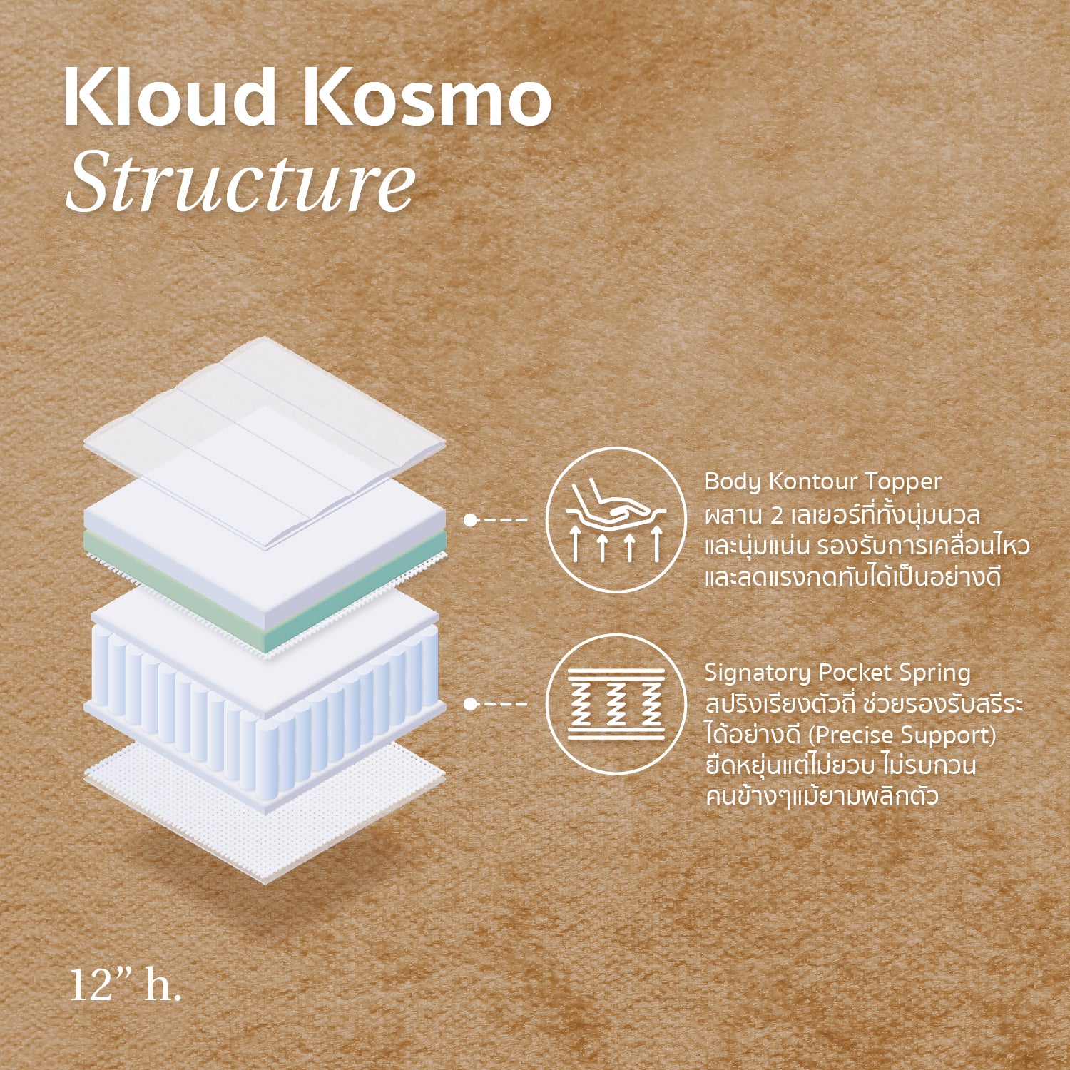 Designed for luxurious relaxation, Kloud Kosmo delivers the perfect balance of plush comfort and support, recreating the sensation of sleeping in a five-star hotel. Featuring the Body Kontour Topper, its dual-layer foam system adapts seamlessly to your body, reducing pressure points and enhancing weight distribution. Equipped with a high-density pocket spring system that ensures superior support with efficient motion isolation for an undisturbed sleep. The Kare Guard System reinforces mattress edges for added durability, while the breathable Tencel fabric cover, woven from natural fibers, offers a soft, airy feel for a truly restful experience.