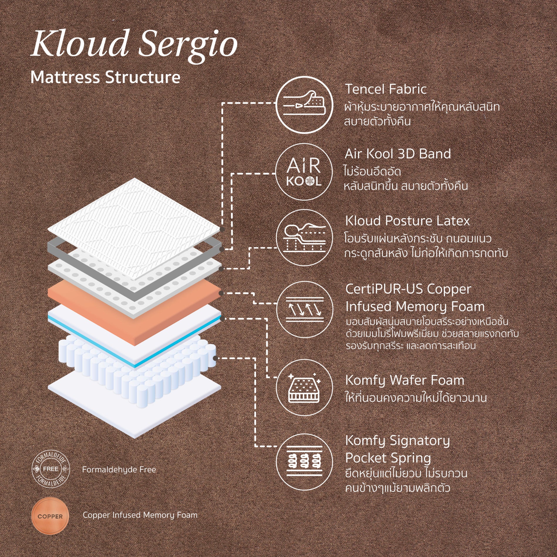 6th Layer : Signatory Pocket Spring – An advanced independent pocket spring system that precisely distributes weight and minimizes motion transfer, allowing you and your partner to sleep without disturbances.