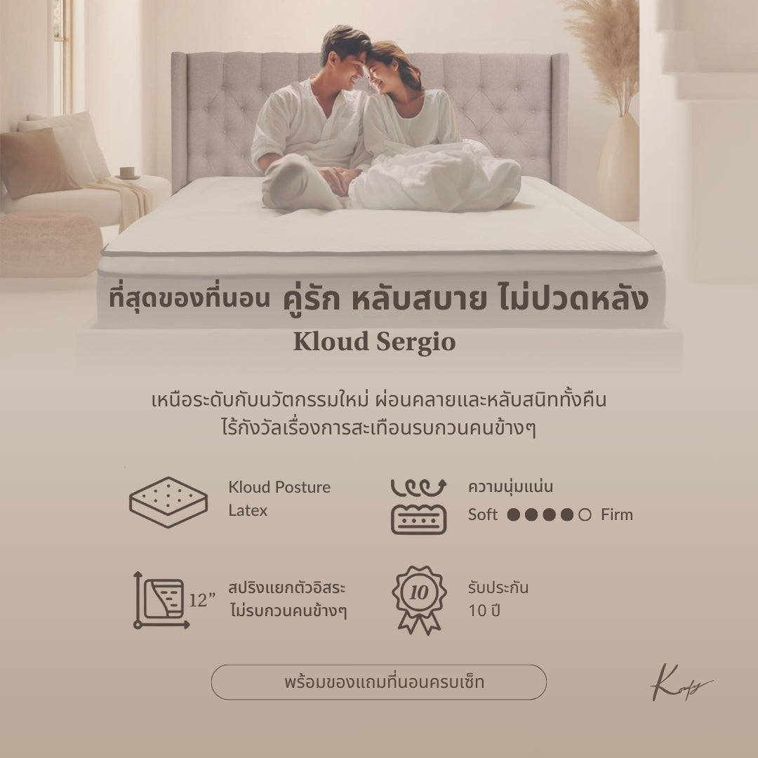 Elevate your sleep with Kloud Sergio, a mattress designed for supreme comfort and spinal alignment. Featuring a 100% natural latex layer, it contours seamlessly to your back, reducing pressure points and eliminating gaps for optimal support. Its independent pocket spring system absorbs motion, minimizing disturbances from movement. Enhanced with memory foam for pressure relief, preventing numbness and discomfort. Wrapped in breathable Tencel fabric ensuring a cool, airy feel for uninterrupted, quality sleep every night.