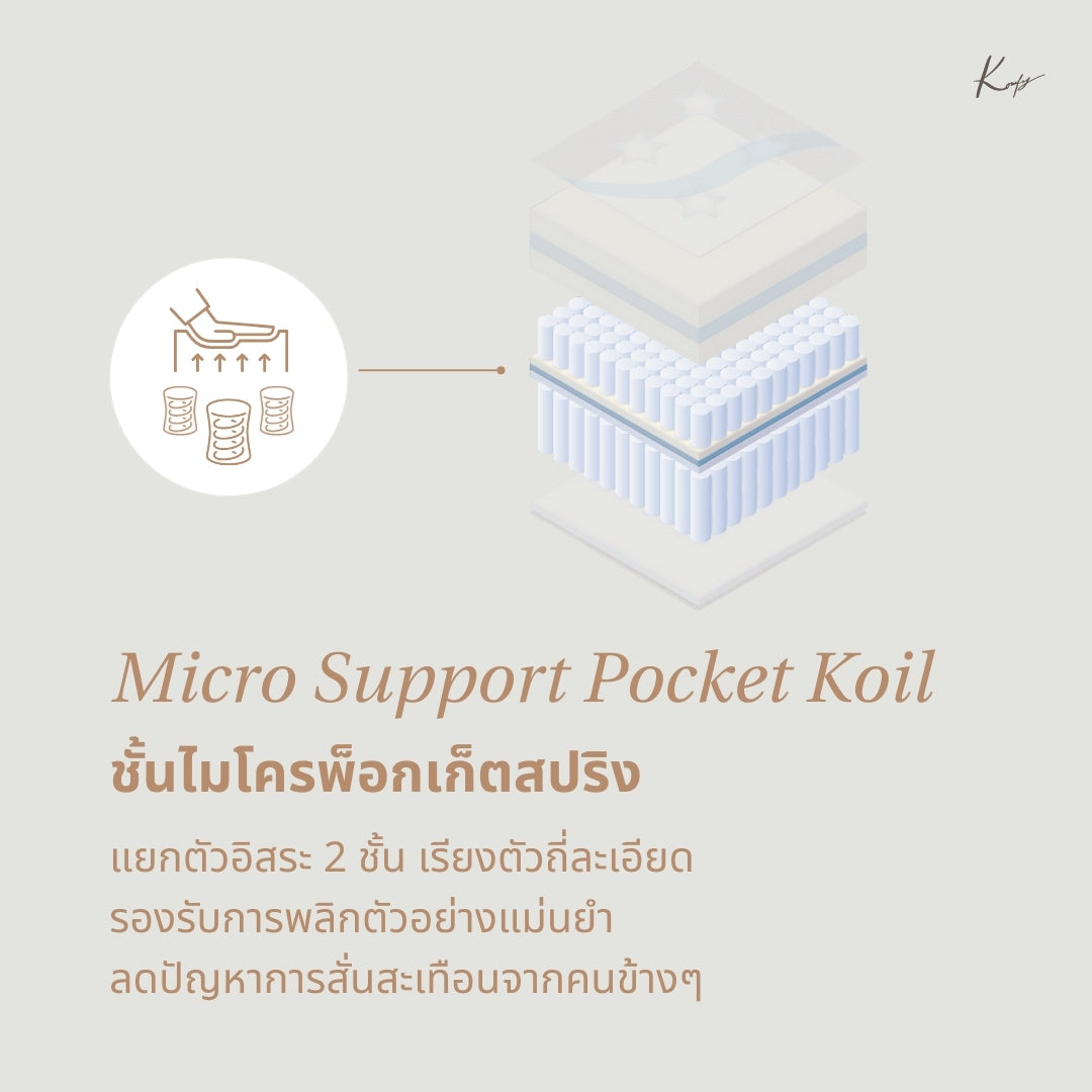 3rd Layer : Micro Support Pocket Koil - A dual-layer micro pocket spring system, designed with high-density independent coils for precise support, excellent motion isolation, and balanced firmness, minimizing partner disturbances.