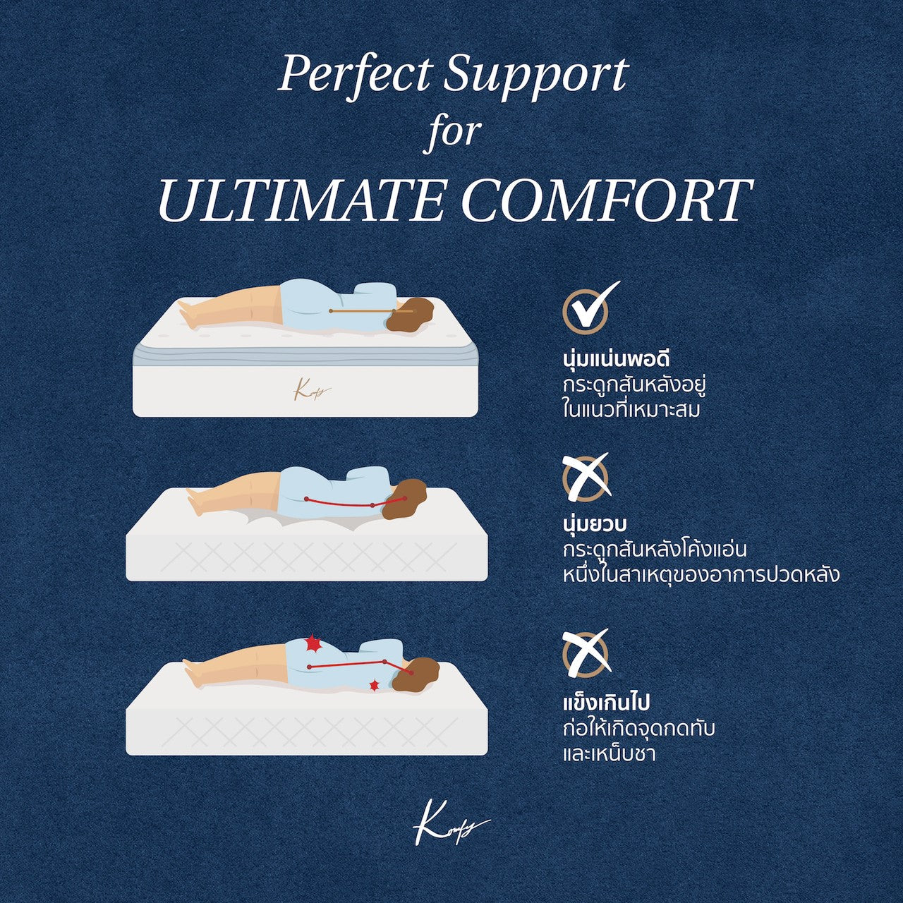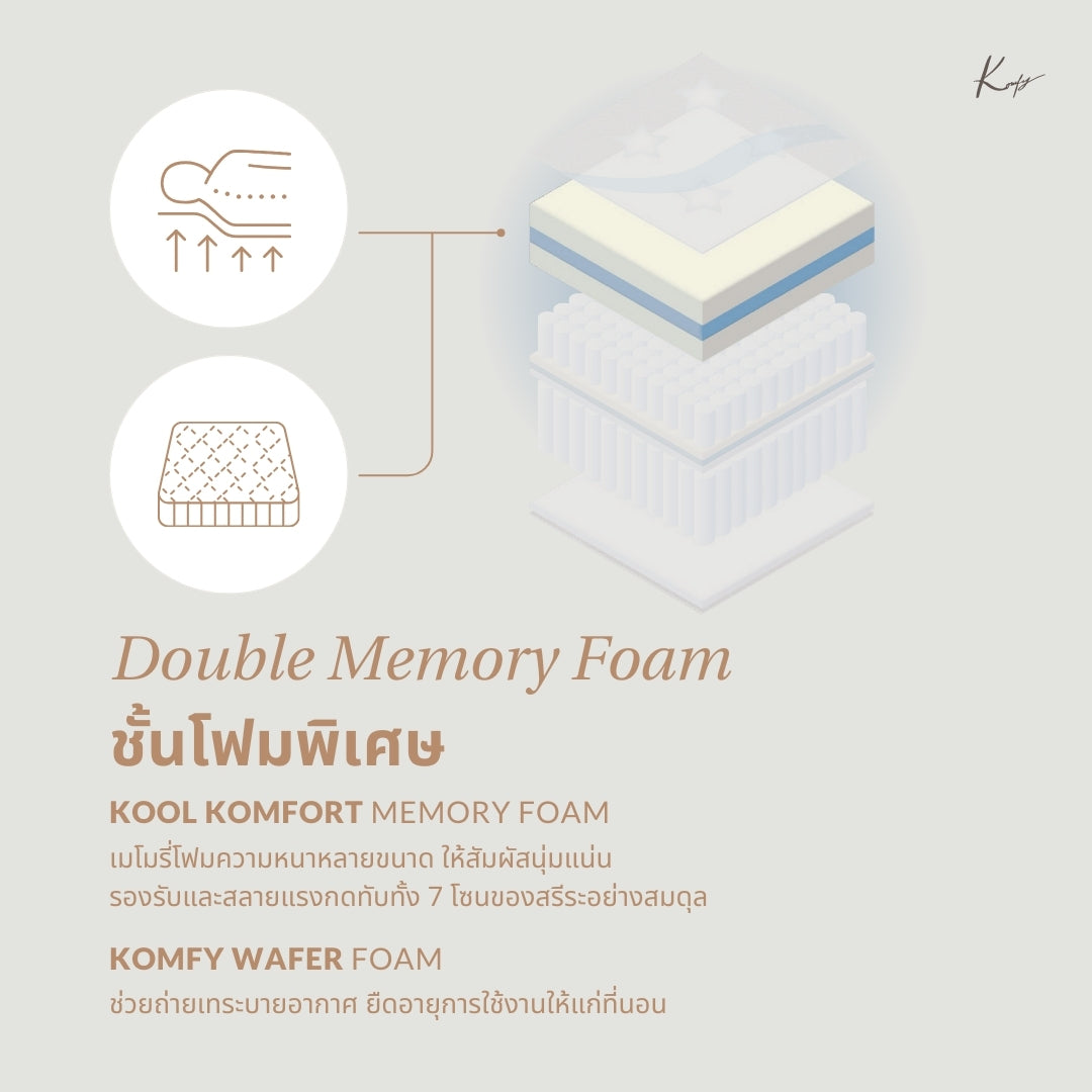 2nd Layer : Kool Komfort Memory Foam - Premium temperature-regulating memory foam that contours to your body, evenly distributing weight and alleviating pressure points, ensuring ultimate comfort, especially for side sleepers.